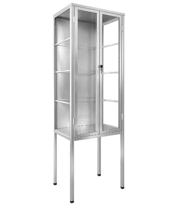 Perfeito para exibir e organizar materiais ou produtos em consultórios, farmácias ou clínicas. Estrutura em chapa de aço inox, com três prateleiras de vidro cristal de 3 mm, porta e laterais de vidro cristal de 3 mm, fechadura Yale.